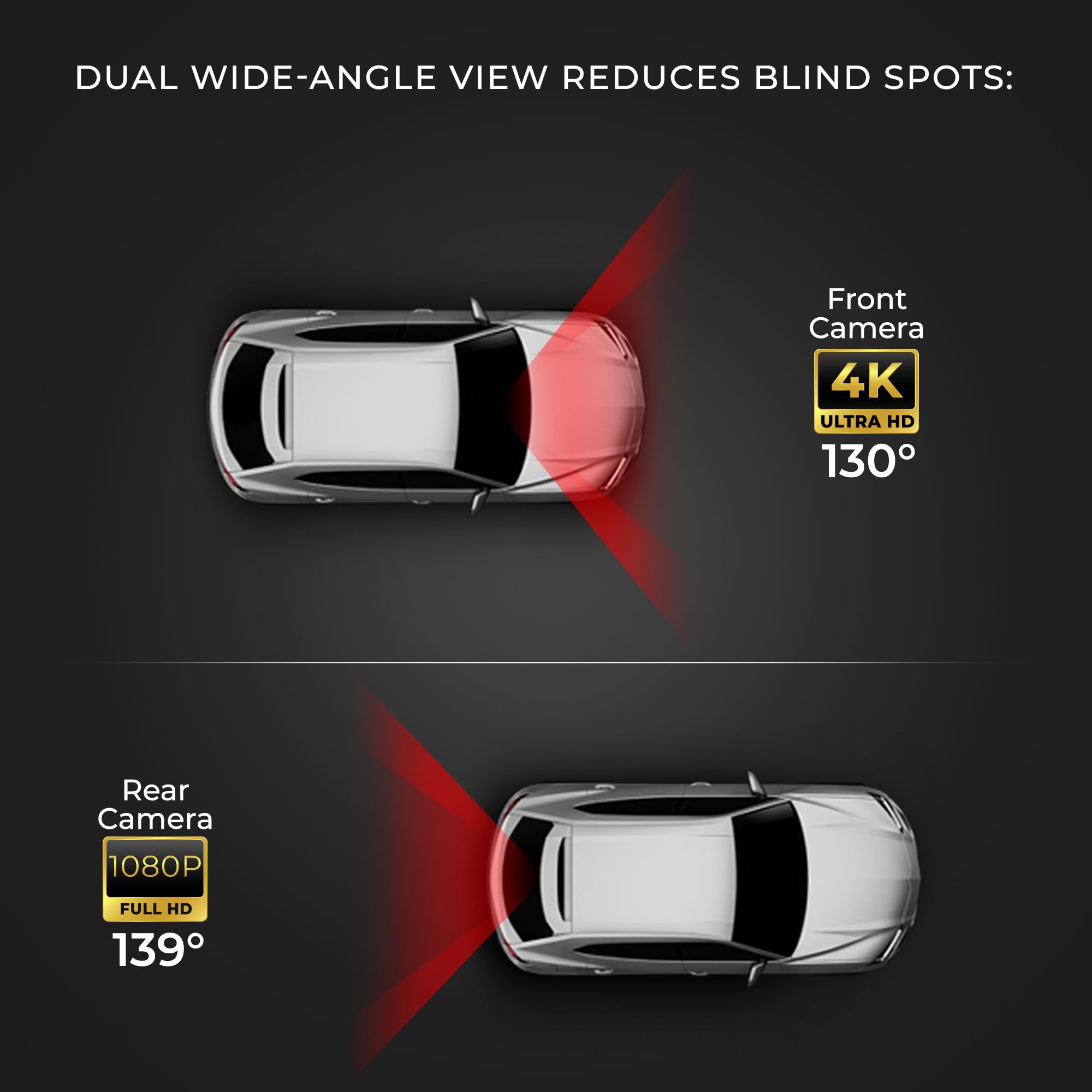 - Wide-Angle Lenses Reduce Blind Spots – 130° front and 139° rear coverage provide full road visibility, ensuring maximum protection both in motion and while parked
