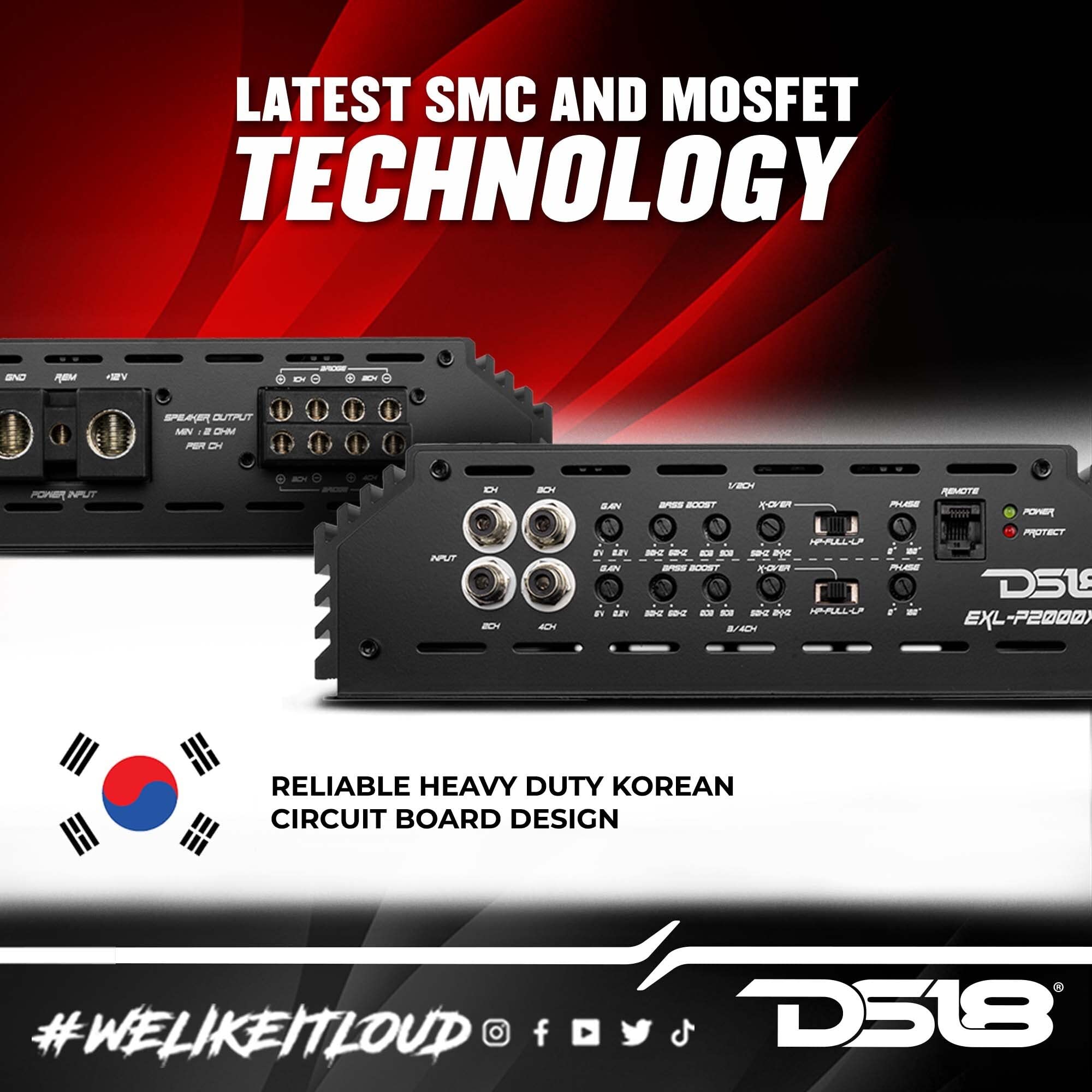 DS18 EXL-P2000X4 Korean 4-Channel Full Range Car Audio Amplifier Competition Grade Class AB MOSFET Amp 2000 Watts Rms - Remote BASS Knob Included