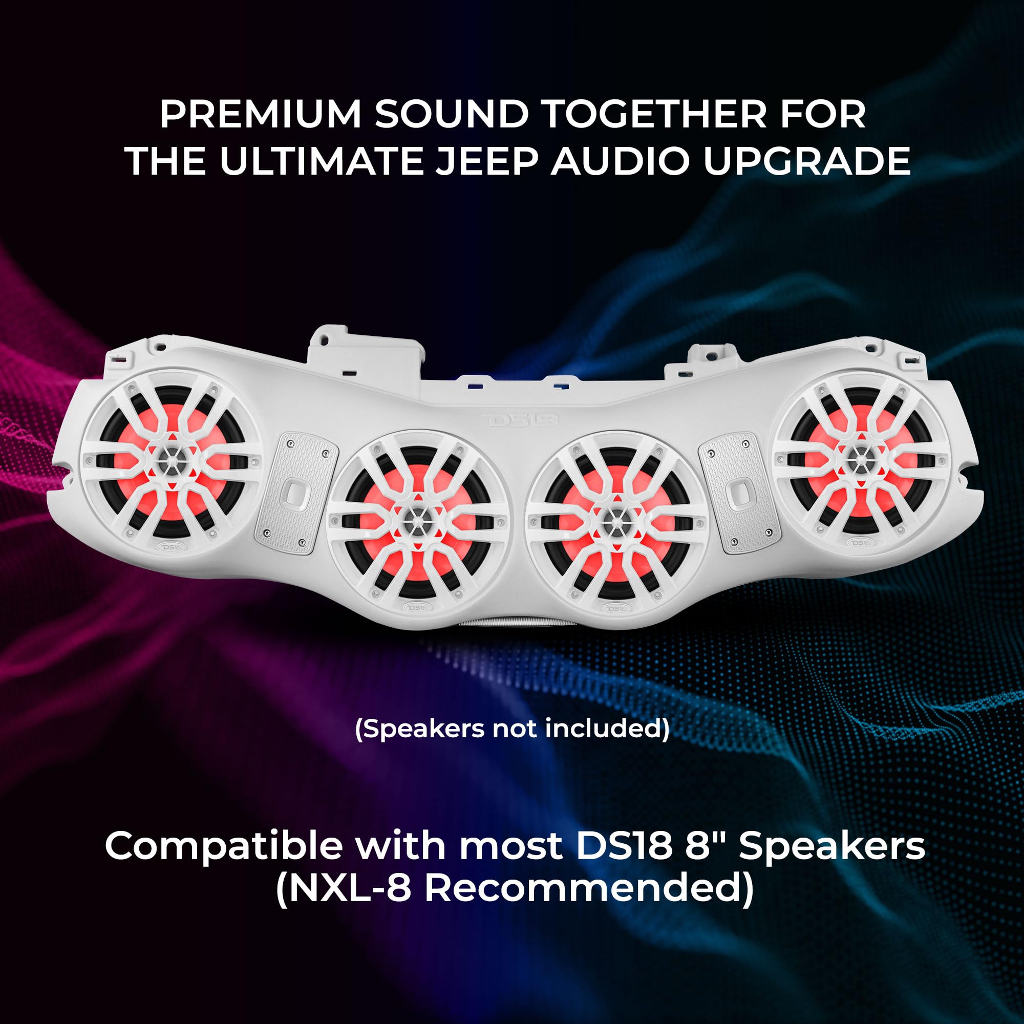 - Superior Audio Experience - Ready to accommodate four 8" DS18 speakers (sold separately), this sound bar elevates your Jeep's sound quality with powerful, immersive audio. Speaker Depth Max: 4.13"