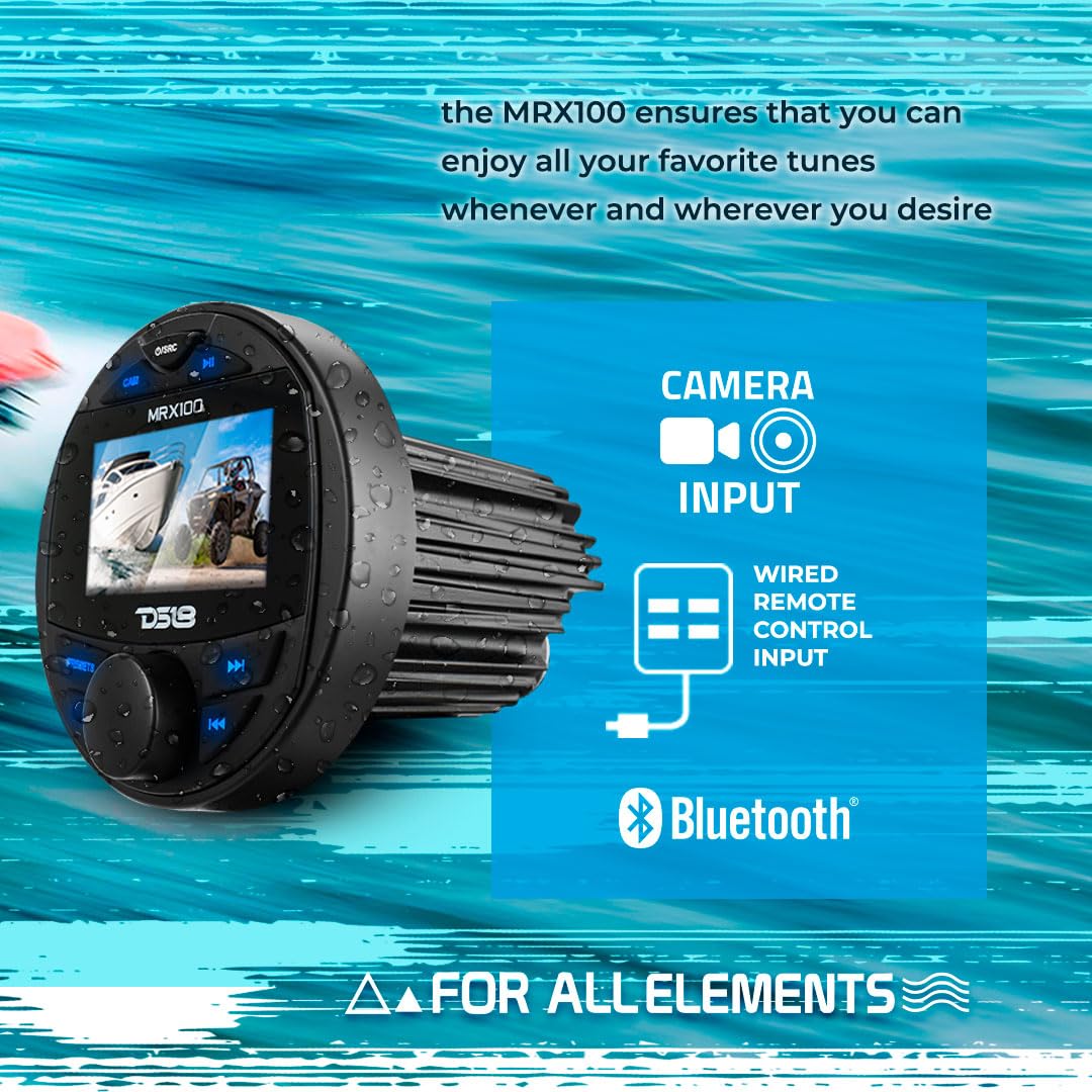 DS18 MRX100 Marine Boat Head Unit - 2 Zones, 4 Volts Output, RDS 4X50 Watts, TFT Video Screen, No CD Player, Bluetooth Audio, IPX6 Rated, USB, MP3, AM/FM Radio Receiver