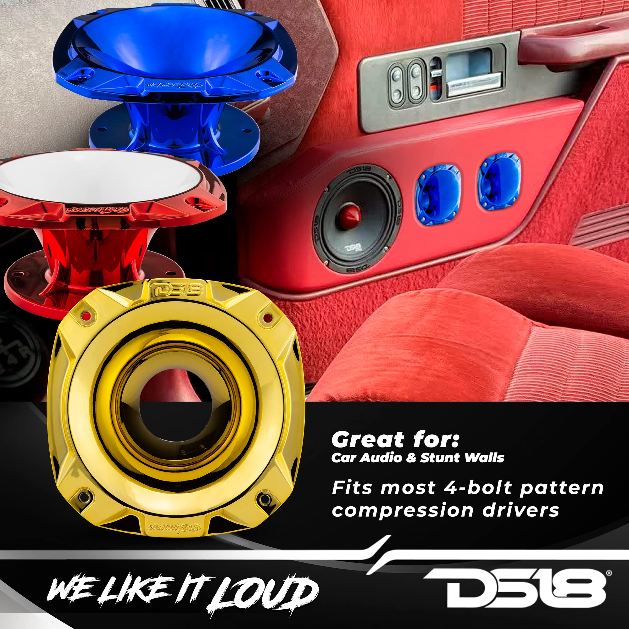 - UNIQUE COLORS - To give your system a more polished look, DS18 is offering the PRO-HP52 in unique colors: Blue Chrome, Gold Chrome, Red Chrome & Red/White Chrome