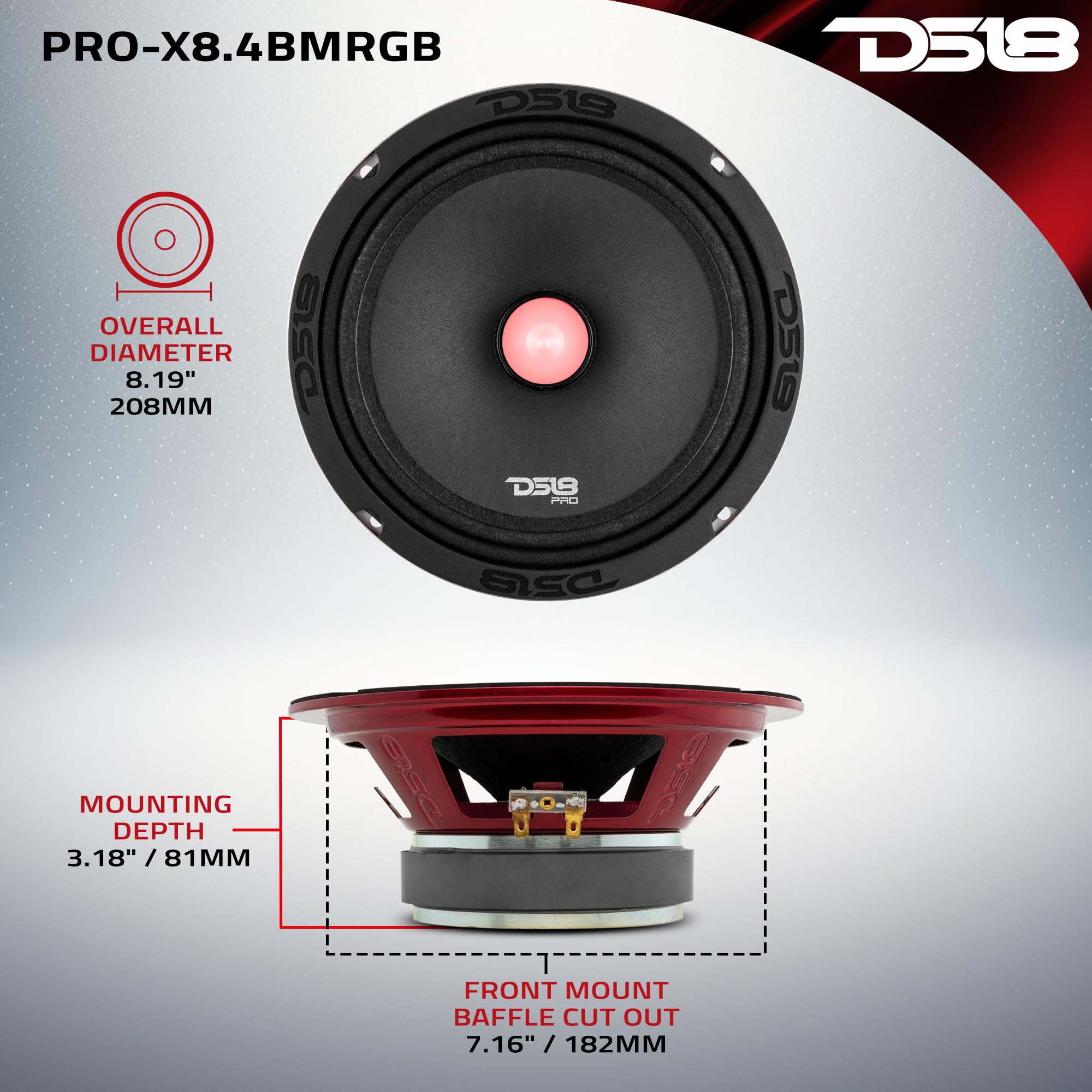 DS18 PRO-X8.4BMRGB Loudspeaker with RGB Light Bullet - 8", Midrange, 550W Max, 275W RMS, 4 Ohms - Premium Quality Audio Door Speakers for Car or Truck Stereo Sound System (1 Speaker), Black