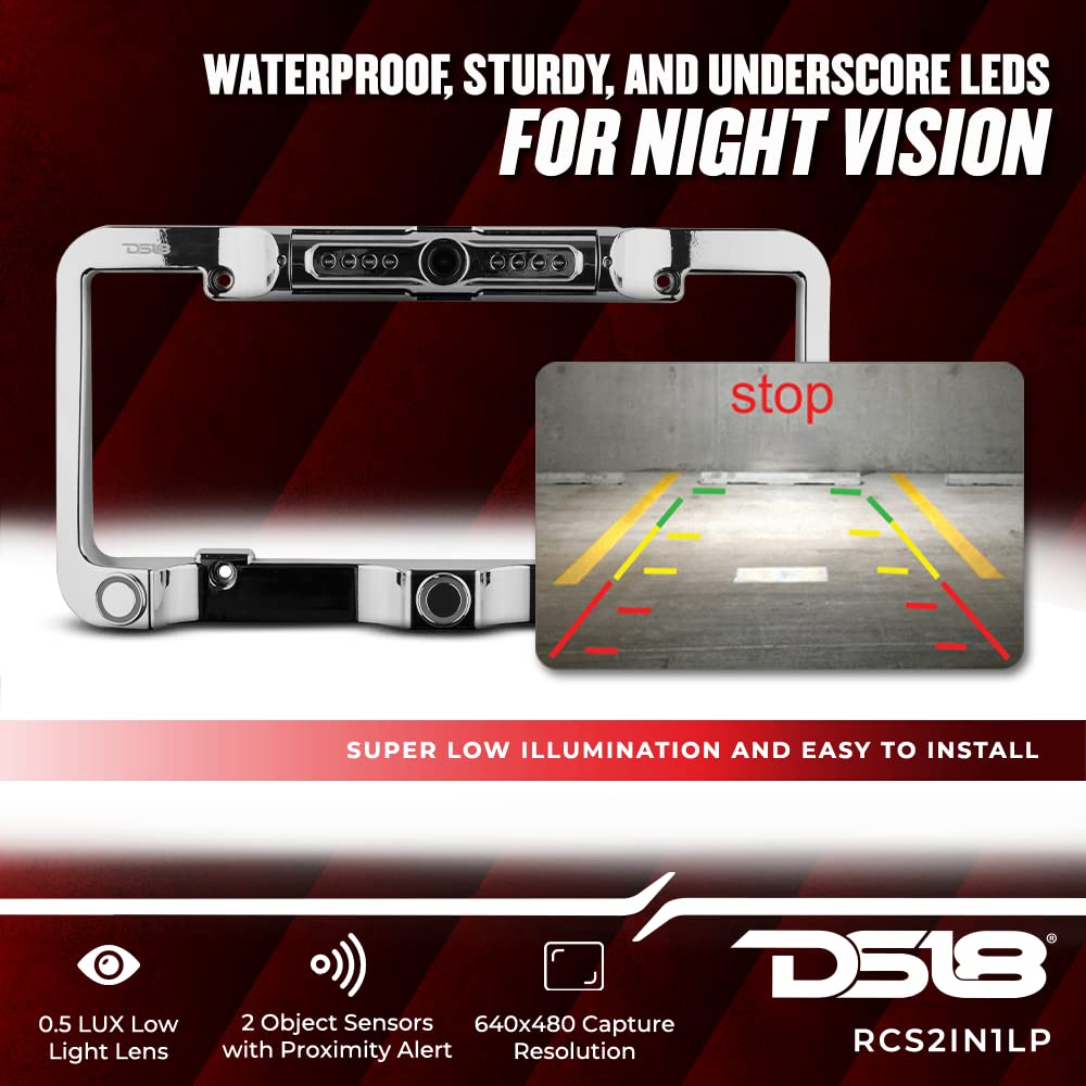 DS18 RCS2IN1LP-BK Reverse Camera and Backup Buzzer for License Plate, Parking/Reverse Assistance, Waterproof Camera Housing, LED Night Vision